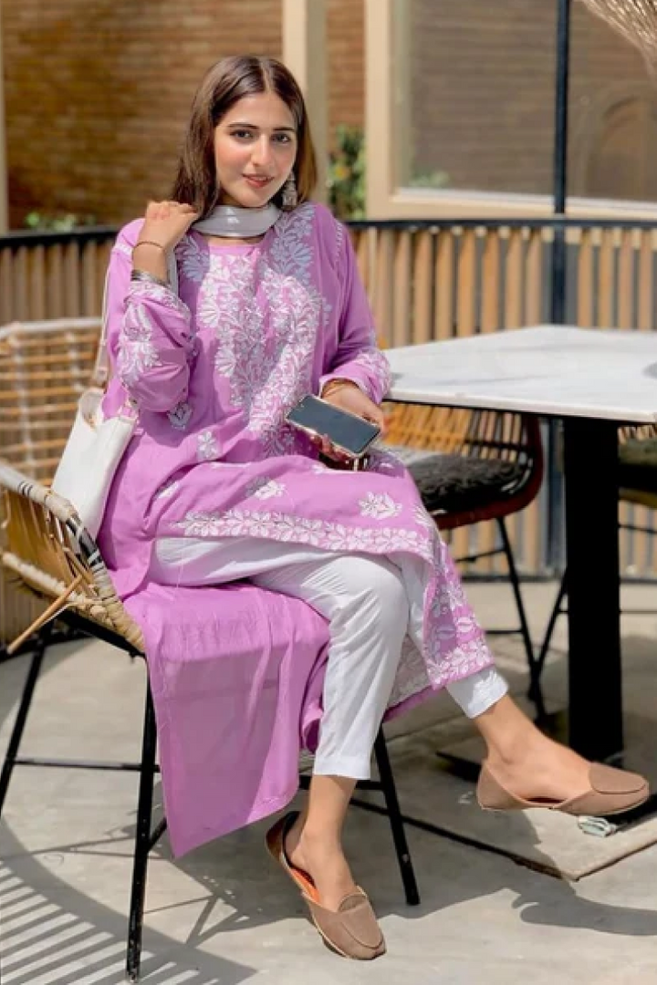 Add a touch of tradition to your wardrobe with Pezwaan’s Lilac Indian Chicken Kari Shirt. The fine chickenkari embroidery on this stone linen fabric ensures both comfort and elegance. Ideal for warm weather, this 47-48 inch long shirt offers a perfect fit and breathability.