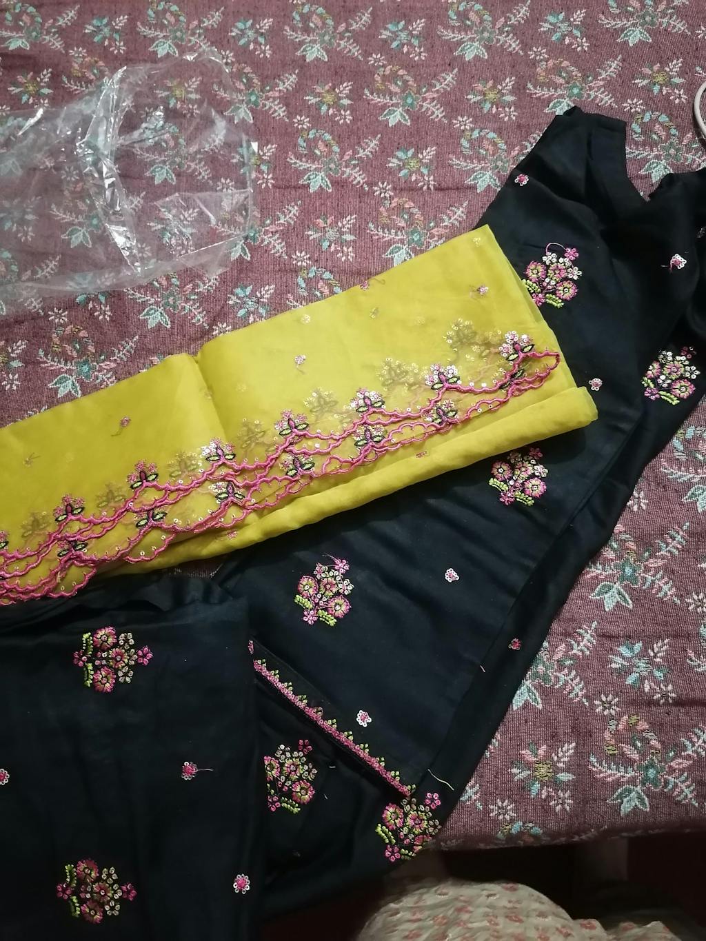 Elevate your style with this graceful Alizay 3-Piece ensemble crafted in premium Marina fabric. The black kurta is adorned with delicate multicolour embroidered motifs, creating a refined yet striking look. Paired with matching straight trousers and finished with a contrasting olive green organza dupatta detailed with subtle embellishments, this outfit beautifully blends elegance, comfort, and timeless appeal—perfect for festive and semi-formal occasions.