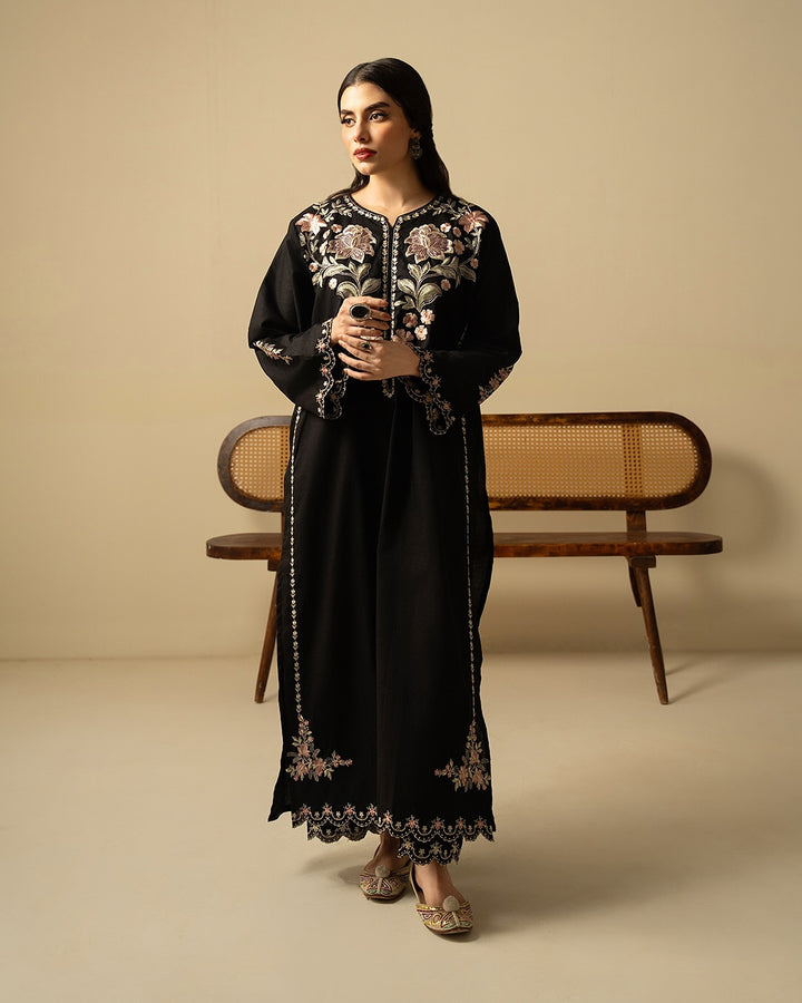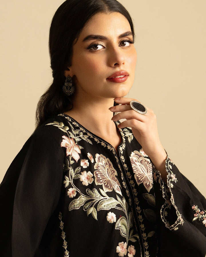 Step into timeless grace with Batool 2PC, a masterpiece in deep black adorned with intricate floral embroidery. This luxurious ensemble is crafted to perfection, featuring delicate pastel threadwork blooming across the neckline, sleeves, and borders—bringing a regal charm to your look.