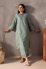 This elegant 2-piece Pista color Lawn set features a long paneled embroidered shirt with heavy embroidery on the neckline, adding a bold, intricate touch. The composed heavy embroidered sleeves are finished with lace, offering a refined, delicate detail that complements the overall design.The shirt is further enhanced with motifs and sequin spread across the center and side panels, adding a touch of glamour and sophistication.