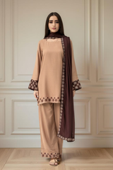 Refine your look with the effortless charm of the Caramel 3-Piece ensemble, crafted in premium Marina fabric. The warm caramel-toned kurta is accented with subtle embroidered details, paired with matching straight trousers and finished with a rich contrasting dupatta. Graceful, comfortable, and timeless—this ensemble is ideal for festive and semi-formal occasions.