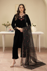 Wrap yourself in timeless elegance with our Royal Amethyst 2PC, crafted from luxurious deep Black velvet that radiates royal charm. The long straight-cut shirt features delicate hand embroidery along the neckline and sleeve cuffs, adding a refined glimmer to the plush texture. Paired with matching velvet trousers, this outfit blends opulence with minimal sophistication — perfect for winter soirées and festive nights.