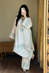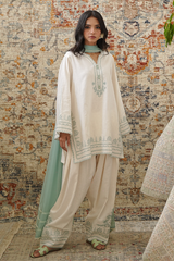 Bring effortless grace to your wardrobe with this elegant Haya 3-Piece Suit. Designed in a soothing pastel palette, this ensemble is crafted from premium breathable fabric that ensures all-day comfort while exuding timeless charm. The soft ivory base is beautifully complemented by delicate mint accents, making it an ideal choice for everyday sophistication, summer gatherings, and refined semi-formal occasions.