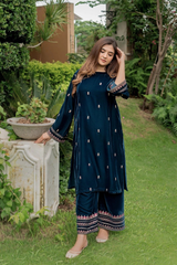 The IZZAH ready-to-wear 2-piece velvet suit features a long shirt adorned with intricate embroidery motifs on the front and beautifully embroidered loose sleeves. Paired with loose embroidered trousers, this ensemble offers a harmonious blend of detailed artistry and comfortable fit, ideal for sophisticated occasions.