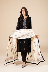 Classic elegance with a contemporary touch. Saya 3-piece ensemble features a sleek black kurta highlighted with intricate embroidered detailing along the neckline and sleeves, adding depth and sophistication to the silhouette. Subtle scattered motifs enhance the overall charm, while the straight-cut trousers keep the look polished and effortless. Completed with a soft, contrasting dupatta adorned with delicate prints and borders, this outfit is an ideal choice for festive occasions, evening gatherings, and graceful everyday wear—where timeless style meets comfort.