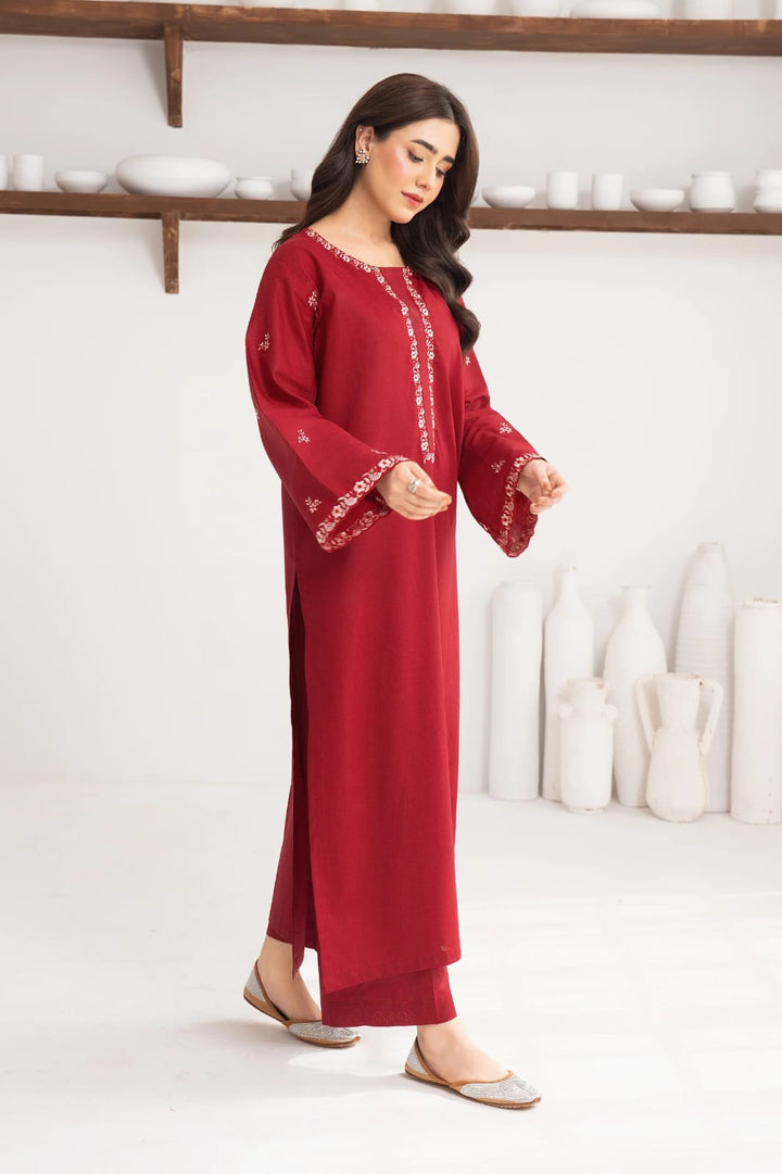 Crafted in premium linen fabric, the Selma 2-piece set is the perfect blend of comfort and elegance. The deep red hue is beautifully complemented with delicate thread embroidery along the neckline, sleeves, and borders, giving it a refined festive charm.