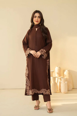 A luxurious deep chocolate brown 3-piece suit crafted from premium Heavy Marina fabric. The shirt features delicate thread embroidery along the sleeves and hemline, accentuating its regal charm. The straight cut enhances elegance while intricate detailing on the cuffs adds sophistication. Paired with matching trousers and a plain dupatta, this ensemble blends comfort with timeless grace. Perfect for evening wear, festive gatherings, or formal occasions